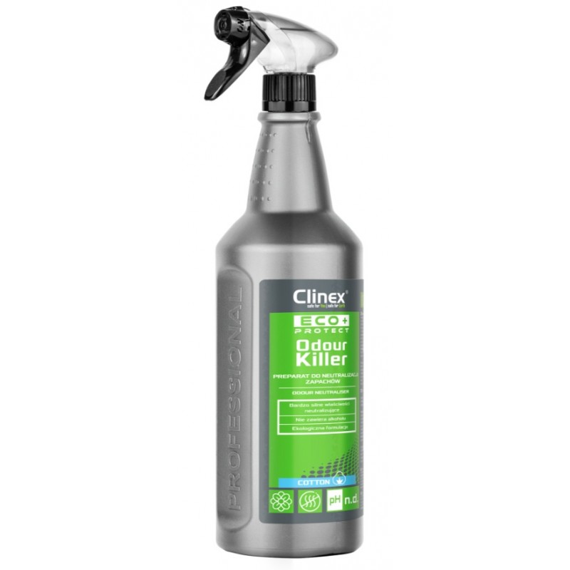 Clinex Eco+ Protect Odour Killer 1L to ekologiczny neutralizator zapachów, który skutecznie usuwa nieprzyjemne wonie dzięki biosurfaktantom – związkom powierzchniowo czynnym otrzymanym na drodze syntezy mikrobiologicznej. Produkt neutralizuje zapachy kuchenne, przemysłowe, sanitarne, dym tytoniowy, spaliny samochodowe, pot, zapachy gnilne oraz zwierzęce, pozostawiając świeży aromat bawełny.