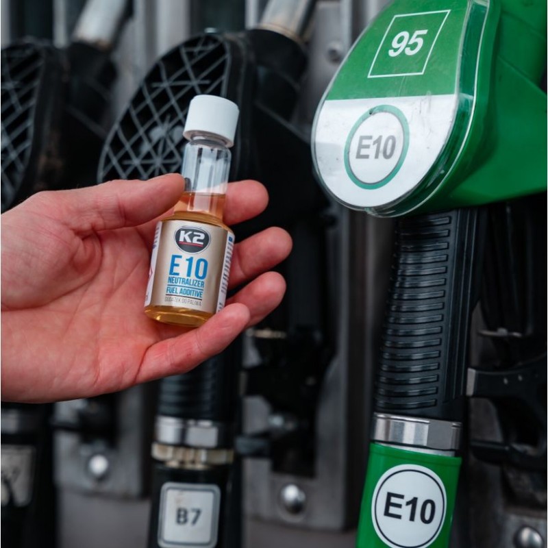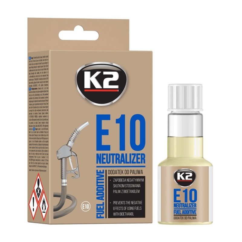 Dodatek do paliwa K2 E10 Neutralizer 50ml poprawia jakość paliwa, zmniejsza negatywne skutki stosowania paliw zawierających bioetanol (np. E10). Zaprojektowany w celu zrekompensowania obniżonej jakości na skutek szybszego starzenia się paliwa, za sprawą dodania do 10% etanolu. Używany podczas każdego tankowania stabilizuje paliwo, czyści i chroni układ paliwowy przed korozją powodowaną przez bioetanol, zapewnia ochronę gniazd zaworów i wzrost liczby oktanowej.